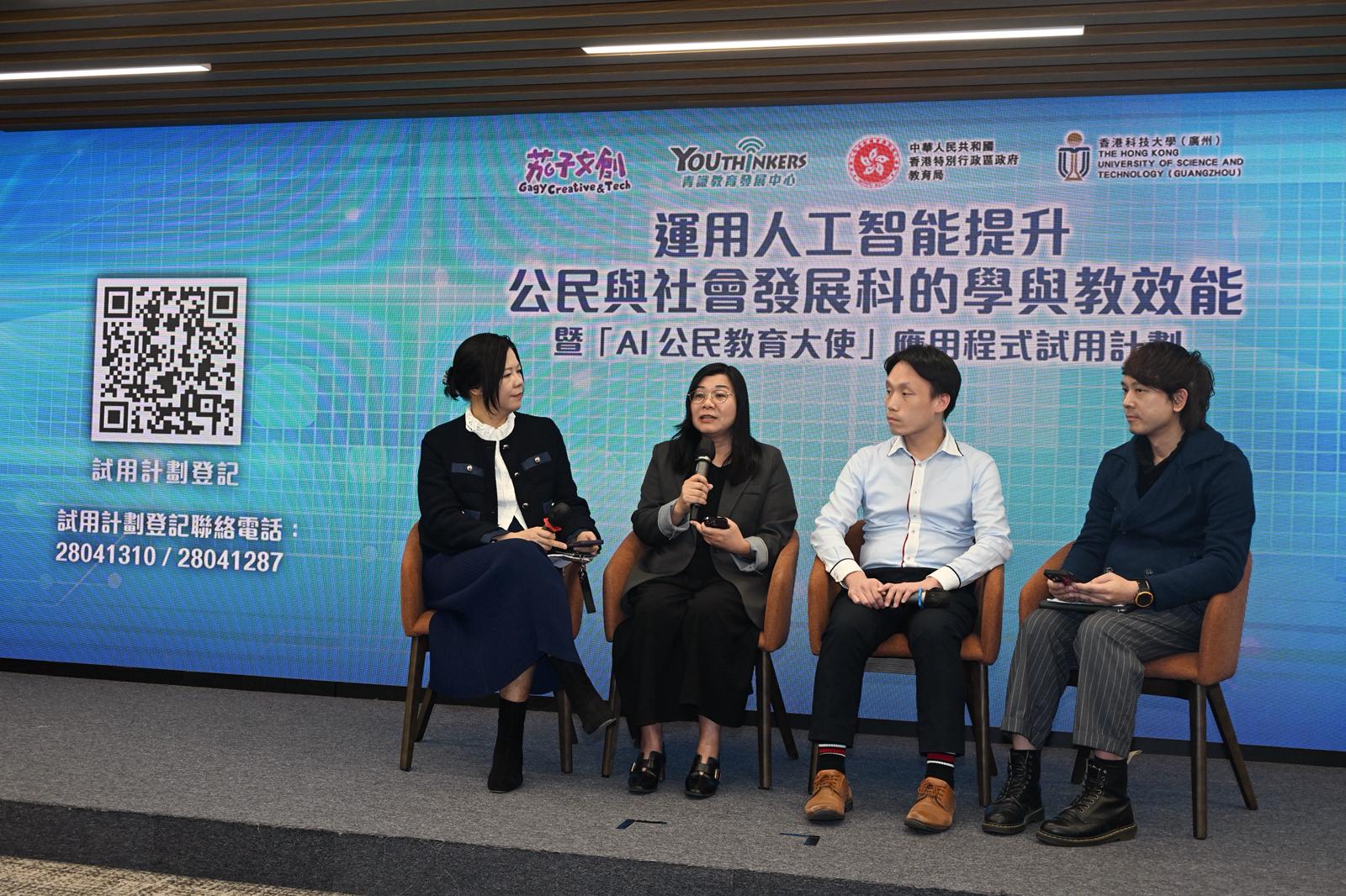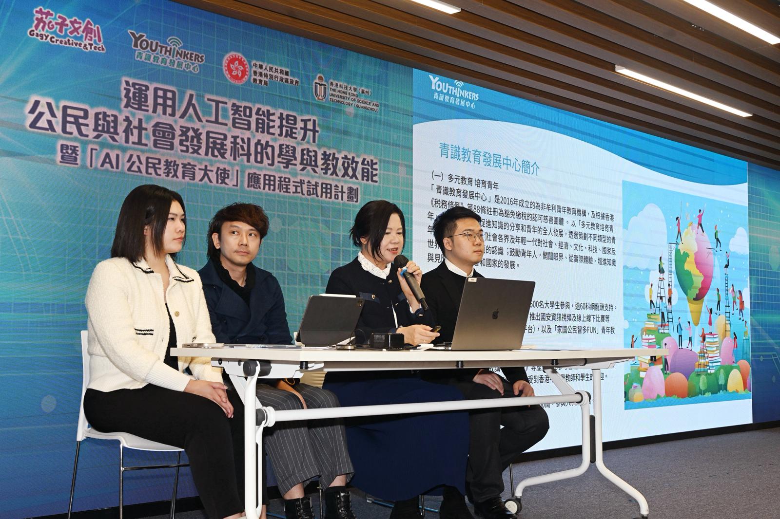 青識教育發展中心執行董事張瑞蓮座談時表示,在人工智能時代下,傳統教育模式面臨轉變,老師將從「知識傳授者」角色轉變為「學習引導者」,並需要具備數據素養、AI應用能力以及跨學科視野,更要掌握AI工具,使之能結合人機協同、因材施教,而學生的學習方式亦從「接受式」轉為「互動式、探索式」。她期望,通過「AI公民教育大使」這個生成式人工智能應用程式,幫助老師輕鬆教學、學生快樂學習、教與學有效評核。