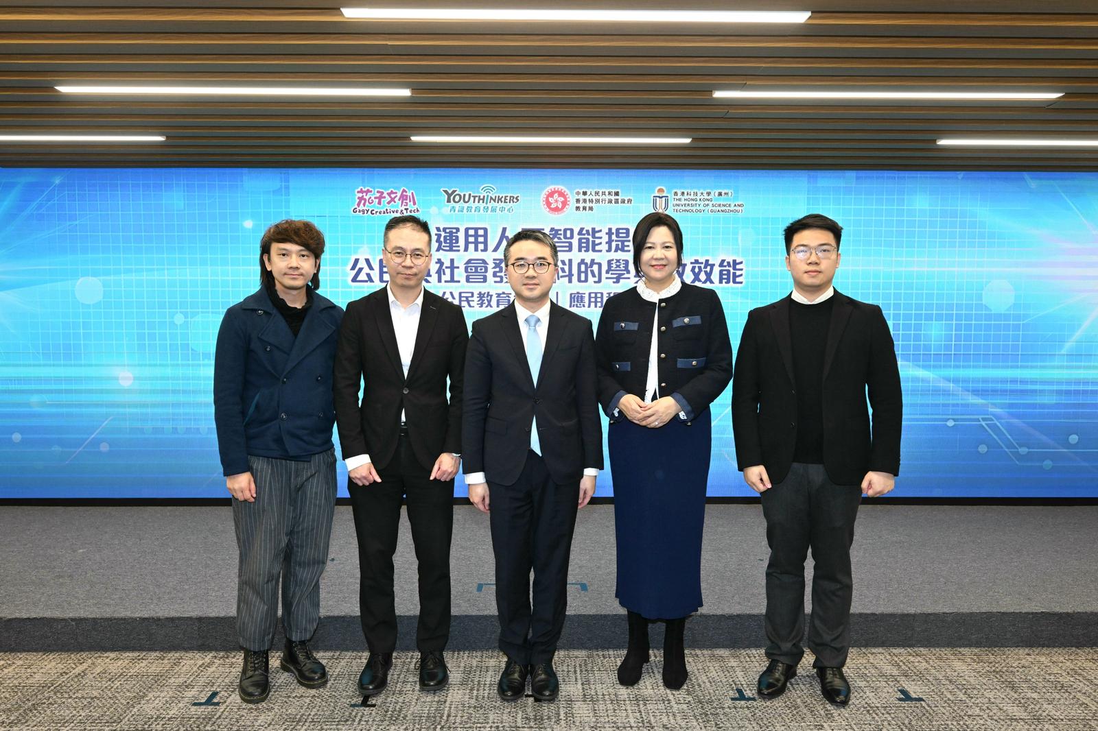為推進人工智能教育、強化教師專業培訓,教育局課程發展處日前(2月6日)主辦「人工智能+公民科」教師專業培訓,與青識教育發展中心、香港科技大學(廣州)元宇宙聯合創新實驗室共同協辦。出席的主要嘉賓包括:教育局副局長施俊輝、教育局總課程發展主任(公民與社會發展) 江紹卓、青識教育發展中心執行董事張瑞蓮、香港科技大學(廣州)元宇宙聯合創新實驗室負責人馬春鳴。逾50名來自不同中學的公民科教師參與培訓,探討如何善用AI提升學與教的效能、並試用「AI公民教育大使」。